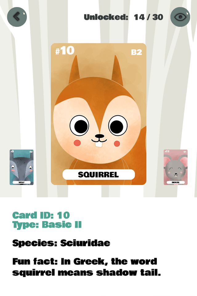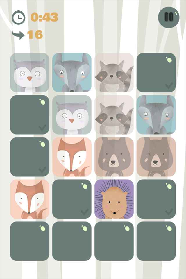 Enjoy playing a memory game including cute forest animals, explore the vast collection of unlockable characters with fun facts about each and every one of them.