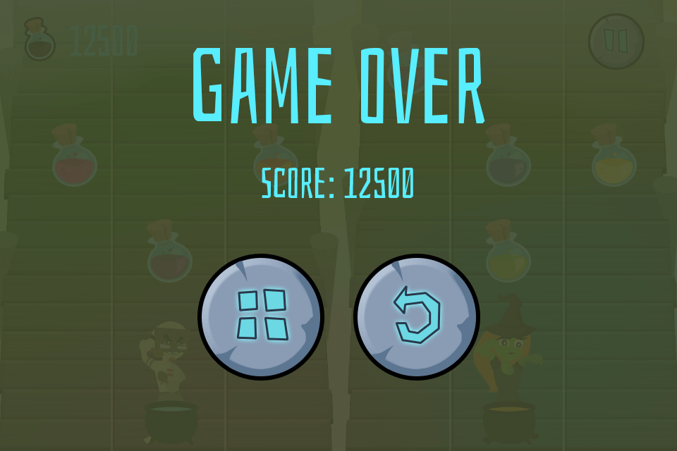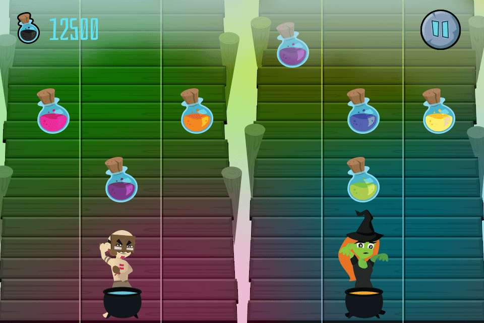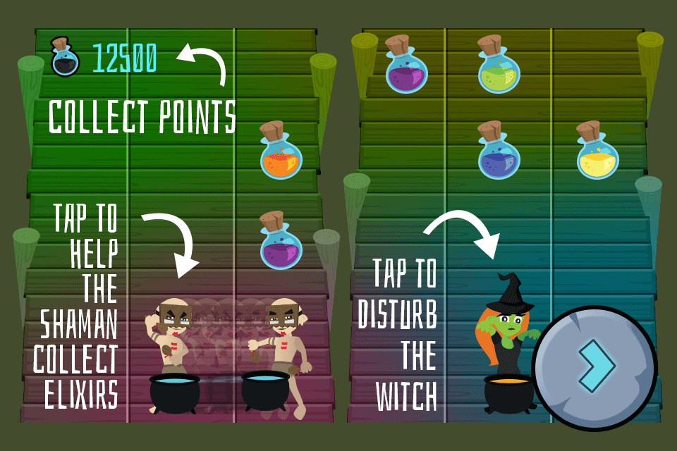 Collect the mixtures yourself as a Shaman by tapping on the left side of the screen. Disturb the Witch to move her and avoid the mixtures on her side.